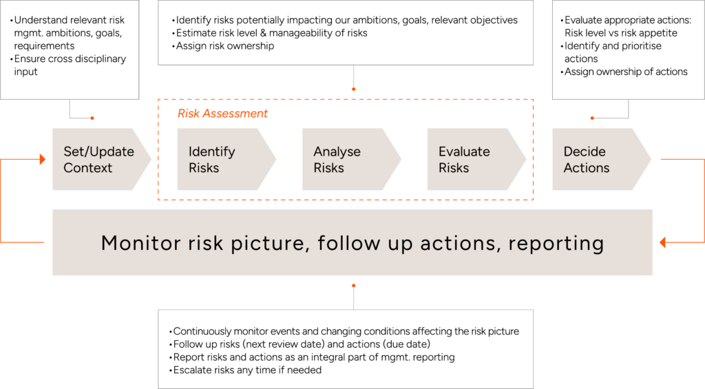 Heimstaden Bostad gives high priority to risk management, and it is treated as a continuous process. We continuously evaluate and develop our risk management function and framework to ensure that we execute a value-add activity. This includes embedding risk management, designating risk ownership, and implementing risk responses throughout the organisation. The Audit & GRC Committee (A&GRC), established by the Board, oversees the framework and process. The risk management process and framework in Heimstaden Bostad are based upon best practice and the international acknowledged standards of ISO and COSO.